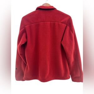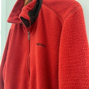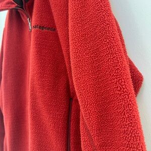 Cozy red fleece jacket by Patagonia. Perfect for warmth and style.