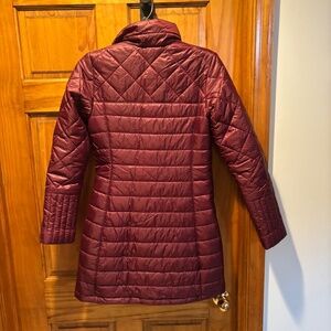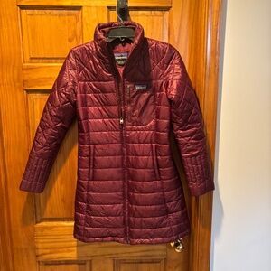 Patagonia Radalie Parka in light balsamic (burgundy). Full zip closure. Hand warmer pockets with zippers. Women's size XS. Small stain at hem but otherwise good condition.