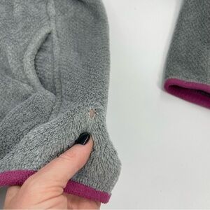 Patagonia Women’s Re-Tool Snap-T Polartec Fleece Pullover in Gray Purple Trim M. There is one small pin hole in the bottom hemline. See last photo. Easy fix. Otherwise very good pre-owned condition.