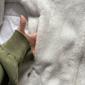 Good preowned condition, has wash wear! Has embroidery on arm! Please see zipper has slight discoloration!