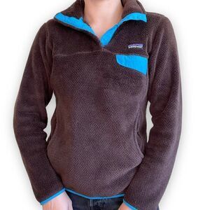 Patagonia Womens Brown Fleece Blue Trim Snap Pullover Sweatshirt Sz XS