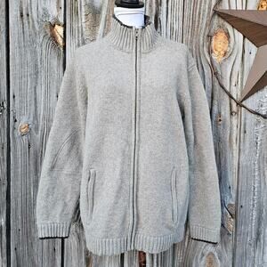 Heathered tan knitted wool fabric w/ dark brown ribbed cuffs and mock neck collar. Long sleeves, full zip front, 2 exterior pockets with zippers, unlined. Issues noted in photos. Very good preowned condition, overall. Size label isn't legible. Listing as a Men's Med, but please use measurements for fit/sizing decisions. Easily a unisex piece. Would work well for a women's oversized boyfriend fit.