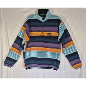 The Patagonia Worn Wear Men's Lightweight Synchilla Snap-T Pullover Jacket in size Medium is a versatile and stylish jacket suitable for winter, fall, and spring seasons. With a striped pattern and snap closure, this regular fit jacket is made by the renowned brand Patagonia. The multicolor design and lightweight feature make it a comfortable and functional choice for outdoor activities or everyday wear. Perfect for men looking for a high-quality and sustainable clothing option.