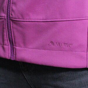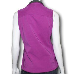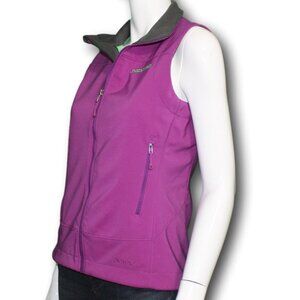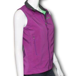 Patagonia women's Adze vest in Ikat Purple with lime green inside. Polartec Windbloc stretch-woven polyester soft shell fabric with a water repellent finish stops wind and resists rain. The lime green is fleece that wicks moisture. The neck and wind flap are lined with microfleect. Two handwarmer pockets and one chest pocket inside, all with zippers. Draw cord hem. Excellent condition, clean, no flaws found. Looks like new.