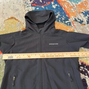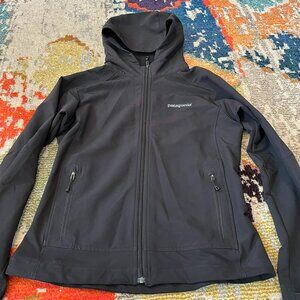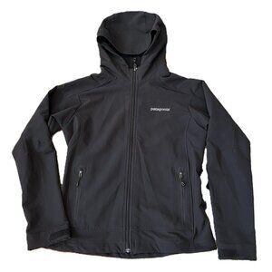 The Simple Guide Hoody is Patagonia's lightest-weight stretch softshell, made with Deluge DWR -- it breathes, resists water and abrasion, wicks moisture, and dries quickly for dry, cool, comfort. Two-way adjustable helmet-compatible hood with laminated visor allows fine-fitting head protection without hindering visibility. Hook-and-loop cuff closures and drawcord hem seals out the cold and wet. Microfleece-lined neck and wind flap provides soft, coziness next to skin. Two zippered handwarmer pockets with garages; one internal zip pocket. Black, women's size Small.