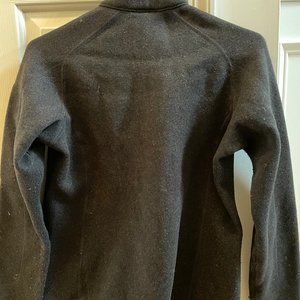 Patagonia black better sweater size small in used condition. Please see small embroidery on front right chest with small defect above. Warm and comfortable.