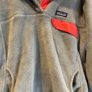 The coziest Patagonia pullover jacket. Neutral grey with cute pink details.