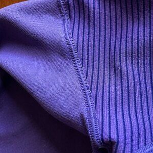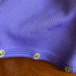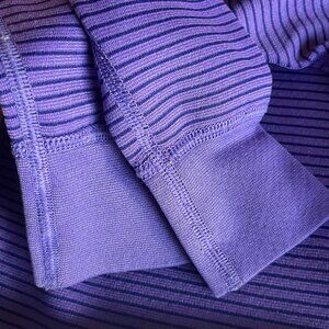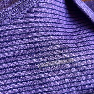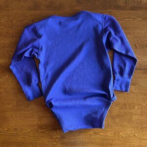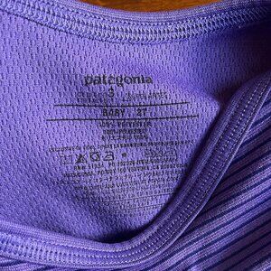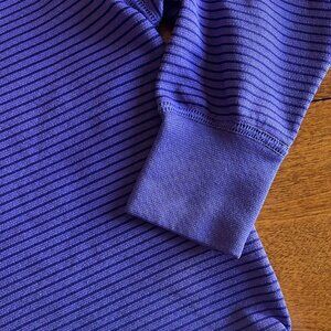 Patagonia capilene baselayer bodysuit/onesie in toddler size 2T. Indigo purple color with stripes on the front and sleeves, and solid purple on the back. Style is #60052, "Baby Capilene 3 Midweight Set," though it's the top only, no pants. Comfortable, breathable fabric and flat seams. Onesie/bodysuit style is convenient even for toddlers who are no longer wearing onesies regularly since it helps keep the top tucked in underneath snowpants or other gear. VGUC; slight all-over wash wear, a few pinprick snags (see close photos).