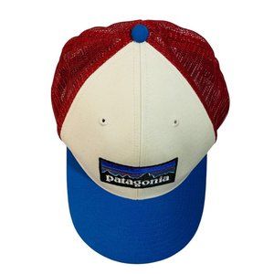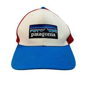 Good condition used Patagonia hat. Two front white panels, blue bill, and red mesh with adjustable snapback.