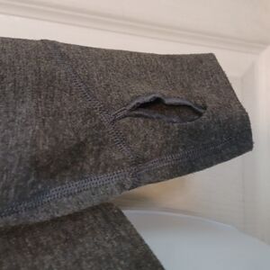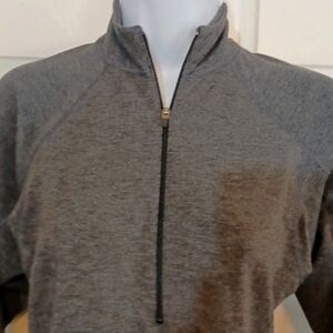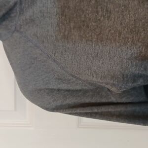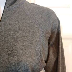 This is a top made by Patagonia of course the stitchwork is extremely nice in this chop it has the zipper that zips can zip all the way up to the neck are you can we've Midway it has the thumb holes for your thumb it's a really good workout top but it also can be wrong of course with a pair of jeans awesome work out where it's in the color gray it's a size extra small it's made of polyester with spandex. the measurements of this top Alliance lab pit to pit a 16 in and the length is 23 in excellent condition