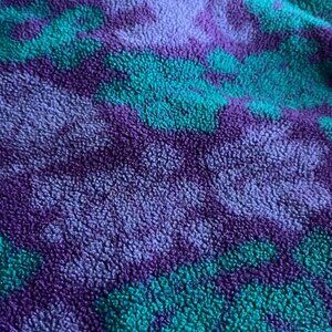 Patagonia vintage quarter-snap synchilla fleece pullover in kids' size 4. Rare and darling 1992 gargoyles pattern in purple, indigo and turquoise, made in the U.S.A. GUC, very good for vintage; slight wash wear on the fleece and violet edges, and one side of the very top snap is damaged and no longer snaps (see close photo).