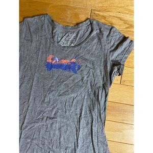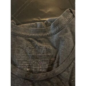 A fitted, short sleeve, scoop neck graphic t-shirt by Patagonia for women. Size large, comes in a versatile grey color, made from soft, breathable cotton. Perfect for a casual, athletic look.