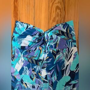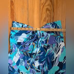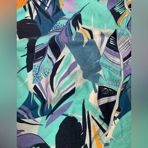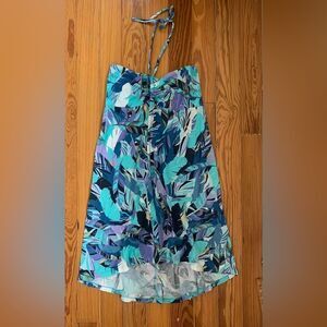 Lightly worn. Teal, blue, purple botanical print. Tie at neckline. Size M