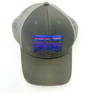 Patagonia Gray Mesh Purple Blue Spell out Mountain Embroidered Snap Back Trucker Hat