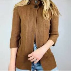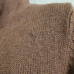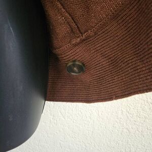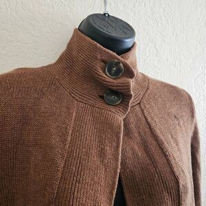 This is a brown lambswool open front cardigan by Patagonia. It features two tortoiseshell button at the collar and an extra sewn inside of the hem. Note a repair has been made near the shoulder, and there is a small pull on one sleeve - both are shown in the photos.