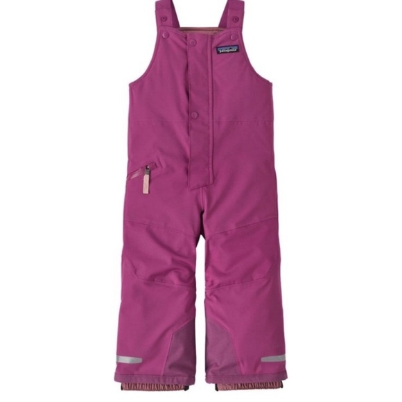 Durable snow bibs for kids. Adjustable straps. Zippered pocket. Ideal for winter activities. Patagonia