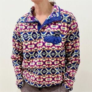 Vibrant sweater with a geometric pattern. Features shades of purple, pink, and blue.