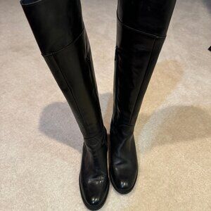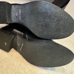 These Italian made leather boots I bought from Italy and they were pricy, they are lovely leather knee high boots with mid way zipper on the inner leg sides. they have some creases and slight scratches that can not really be seen with naked eyes, or I can't see them anyway. Been used twice only. they are too tight for me on the top around my calves. They are 19 inches long in the front and 15 inches in the back. size 36 no box or dust bag.