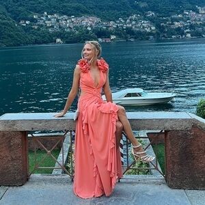 Floor-sweeping maxi dress made from a lightweight chiffon fabric. Voluminous flutter sleeve made from layers of ruffles. Subtle ribcage cutouts are strategically placed at the smallest part of your waist to flatter your figure. Fabric-covered buckle at center. Lace-up tie back closure. Fully lined. Runs true to size.