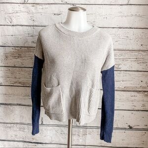 Knitted from our favorite yarn, this colorblock crewneck sweater has an easy, boxy fit and a high-low hem made for half-tucking. Maybe the best part? Those cute retro patch pockets.