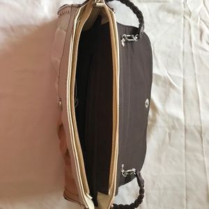 Cute tan and brown patch purse. Has a small zip pocket in the front. It’s not too big or too small, it’s just the perfect size.
