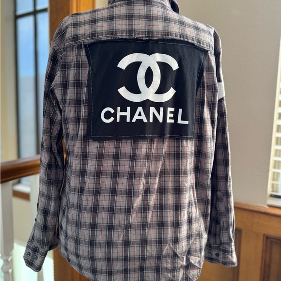 Cute patch work button down with Chanel on the back