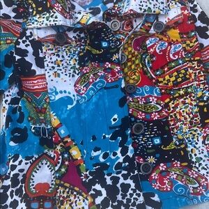 Vibrant patchwork design. Long sleeves. Button-up front. Unique and stylish.