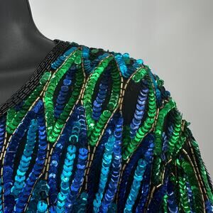 Patchouli Silk Jacket WMNS XL Black Green Blue Beaded Sequin Statement Coat Vtg