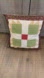 Decorative throw pillow featuring a patchwork design. Red and green and tan accents on a cream background. Perfect for adding a cozy touch to any room. This pillow handcrafted at Sew Amazing Handcrafts what are the perfect attached to your couch, bedroom, sofa, recliner, bench. Featuring a bear paw “pattern I have designed this out of old-fashioned/antique cotton prints.