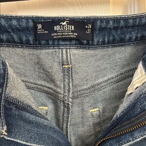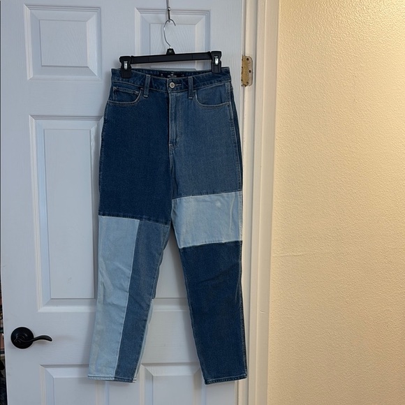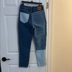 Stylish patchwork jeans featuring a blend of dark and light blue shades. Perfect for a trendy, casual look. Small imperfection on the front of the jeans (second picture). Size W26 L27