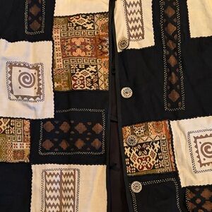 Stylish patchwork button-up jacket with intricate patterns. Features black, cream, and brown colors. Completely lined.