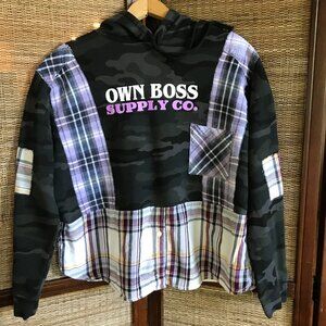 Upcycled patchwork camo hoodie, size M-L. This patchwork hoodie sweatshirt features a black and gray camo base with violet, black, and white plaid flannel patches for unexpected color and texture. The raw seams give it that worn-in, streetwear edge, while the "Own Boss Supply Co." graphic says exactly what you’re about—doing things your own way.