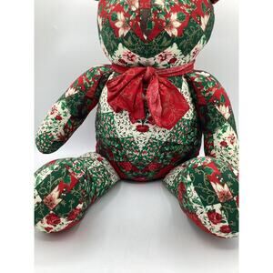 Patchwork Christmas Bear With Red Ribbon 23 inches Tall Vintage