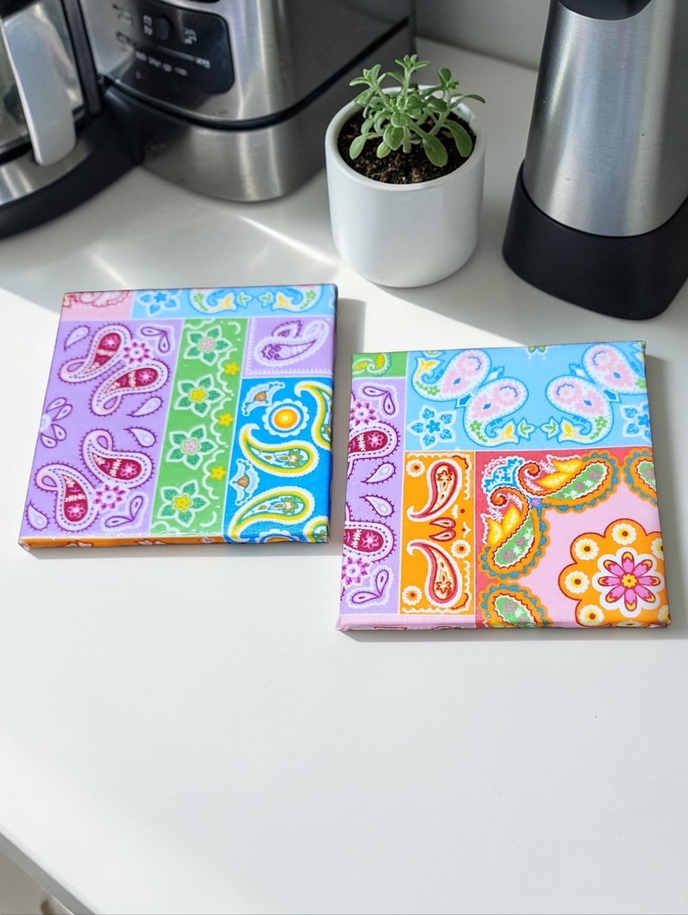 Spring is,in the air with this coaster set. The colorful patchwork design is perfect for your outdoor party.