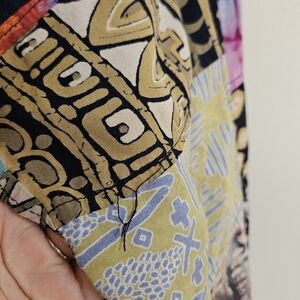 measures like a 2XL. awesome patterns and patchwork jacket. see small rip, can be sewn, and some loose threads. not terribly noticeable.