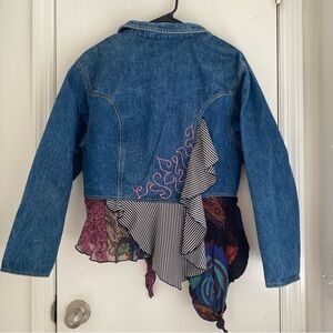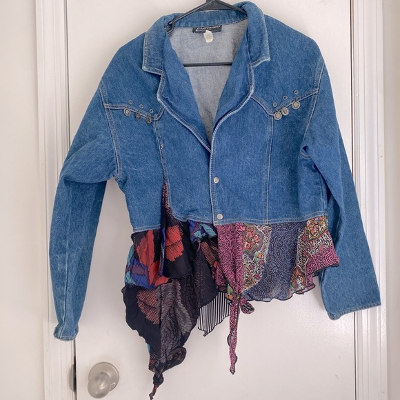 Stylish patchwork denim jacket featuring a unique blend of colors. Perfect for adding a pop of color to your wardrobe.