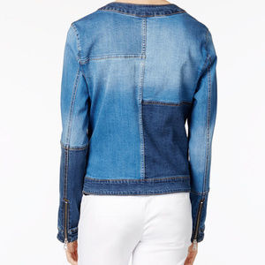 Patchwork lends a playful vibe to this denim trucker jacket from INC International Concepts.