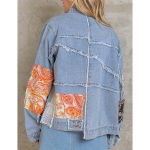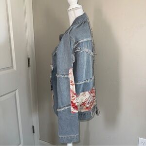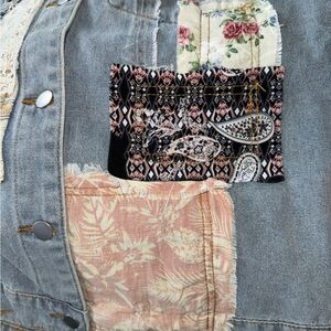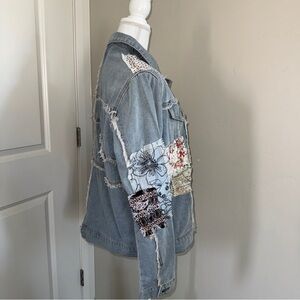 This jacket is a light wash of hazy-blue distressed denim, with silver buttons, faux front pockets, and lace, floral, and paisley patchwork with outseam stitching on the front, arms, and back of the jacket. Patchwork squares are mainly neutral tones with hints of pink, red, and orange.