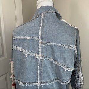 Patchwork Denim and Lace Jacket Distressed Boho Denim Shacket Mixed Floral Lace