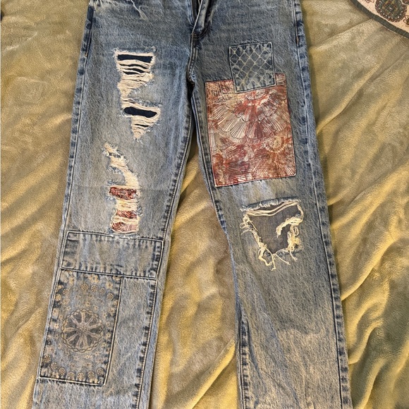 Stylish patchwork distressed jeans in a classic blue. Perfect for a casual, trendy look. Fits like 26