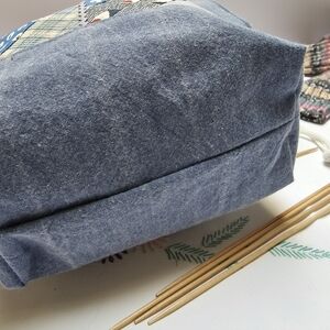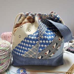 Colorful patchwork drawstring bag with blue, cream, and tan patterns. Perfect for carrying essentials. Handmade out of vintage quilting fabric. Ideal for travel and sock knitting projects.