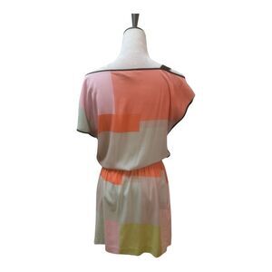 Chic patchwork dress featuring a unique one-shoulder design. This eye-catching mini dress showcases a geometric print with stylish, short sleeves and an elasticized waist for a flattering silhouette. The striking combination of colors and patterns makes this dress a standout piece.