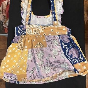 Stylish patchwork dress featuring a mix of purple, yellow, and blue patterns. Perfect for a unique look.