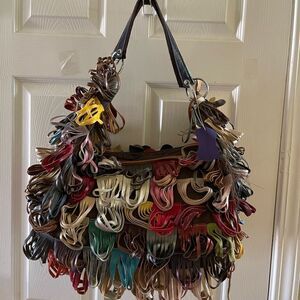 Patchwork & Fringe Multicolor Leather Slouch large Shoulder silver tone hardwares top zipper the inside lining has a side zipper two side pockets.Pre owned in good used condition the inside side zipper is missing the handle still works.see all pictures any questions please message.