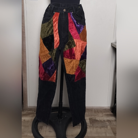Stand out with these vibrant patchwork high rise jeans, featuring a unique blend of colors. Perfect for adding a bold touch to your wardrobe. waist 26 inches,hips 34 inches, length 28