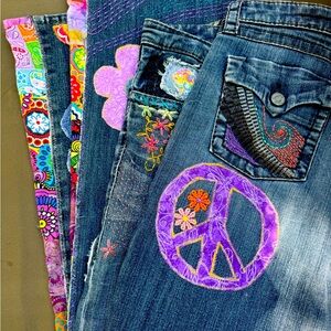Beautiful one of a kind jeans made by a local artist. Absolutely gorgeous and high quality. All you need is LOVE 🫶 so many small details and so unique. Make an offer!