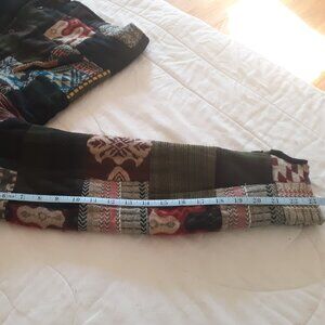 With a multitude of patterns and textures, this is wearable art! The jacket features a soft black fleece lining, wooden buttons, and pockets that actually function as pockets--all while looking beautiful and unique.