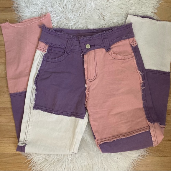 Pink, purple, and white patchwork pants. High waisted. Raw hem. Size small. From Amazon. No flaws, smoke free home.