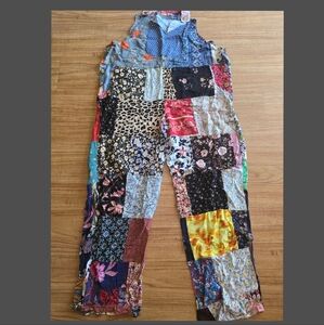 Vibrant patchwork jumpsuit featuring a mix of colors for a bold look. Perfect for making a statement.