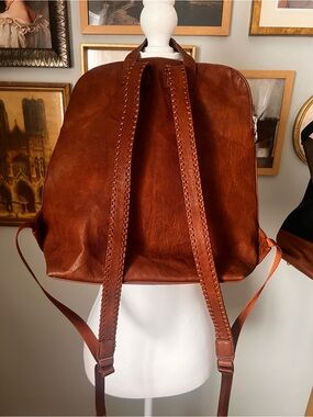 Stylish multicolor patchwork leather backpack by Desigual. Features rich brown leather trim with warm orange, pink, cream and tan accents. Versatile design with a front zip pocket for easy access. Perfect for daily use and adds a colorful, crafted touch to outfits.